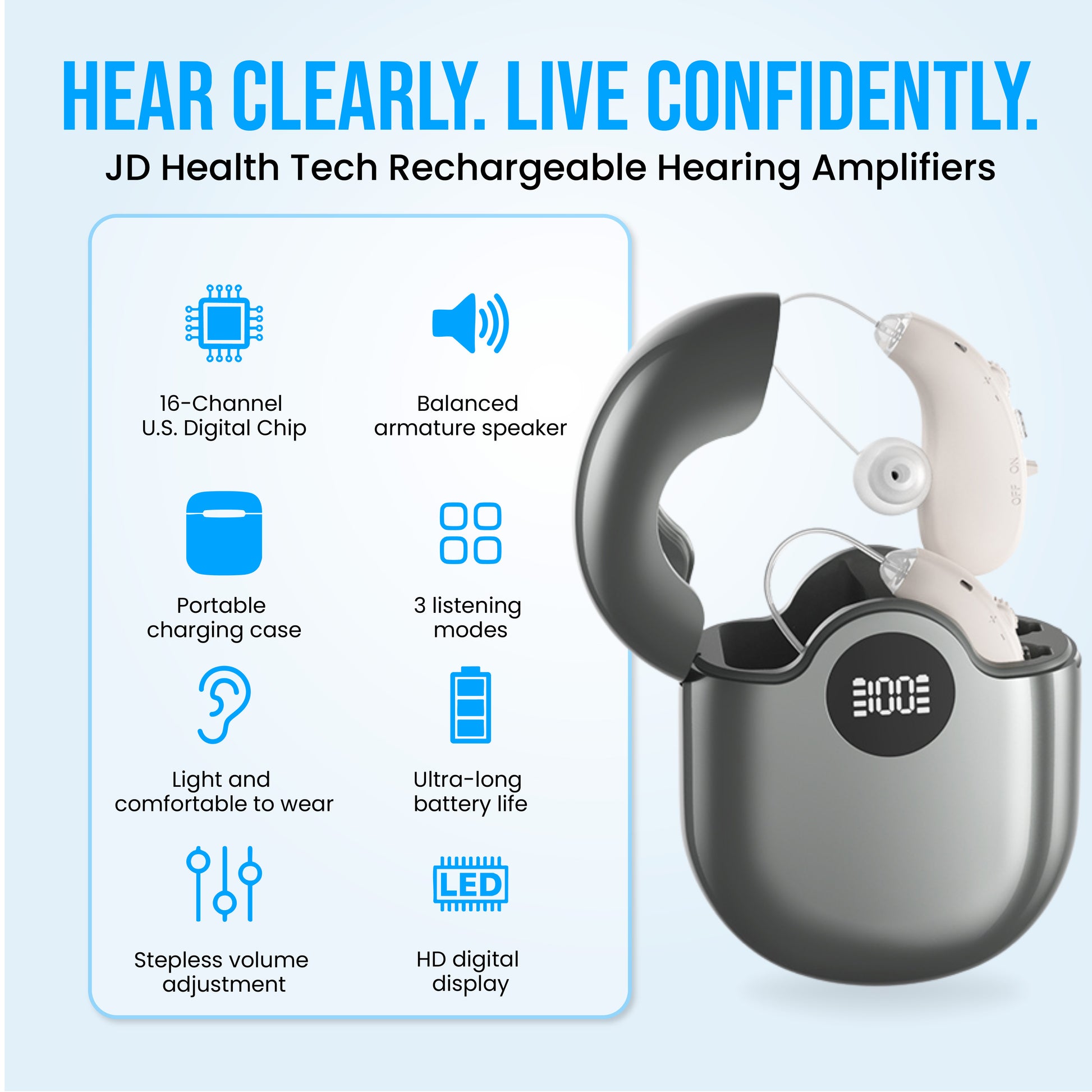 Experience the JD Health Tech Hearing Amplifier — designed to make conversations easier to follow and everyday sounds more comfortable. With noise reduction support and a discreet design, it helps you stay connected to the people and moments that matter most.